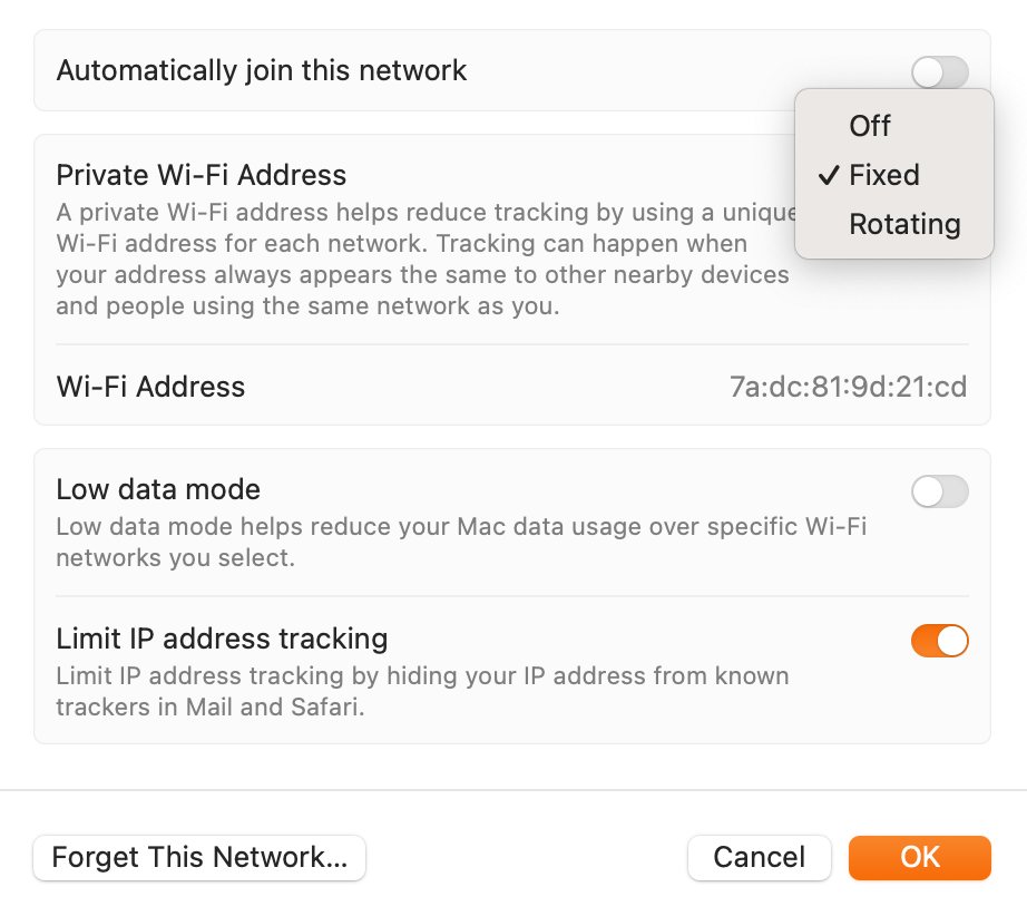 So ... "Rotate" means the MAC address will change every now and again when you're connected to the network. "Fixed" means it won't change while you're connected, but may change when you disconnect and re-connect a while later, and "Off" means it'll never change and it will be your actual hardware MAC address.