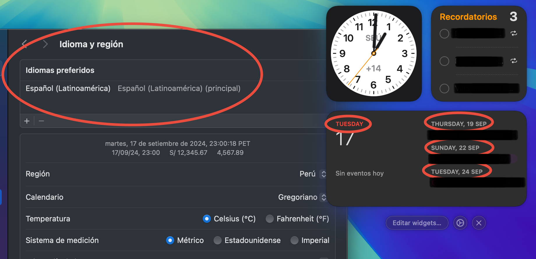 The calendar widgets show the months and days in English, when I have configured the language "Spanish" in the settings