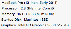 MacBook Pro 15" Early 2011 2.0Ghz, 1TB EVO SSD, 16GB 1333Mhz RAM. Everything else are Apple components. Here are some of my observations (these have been pointed out many times already)...