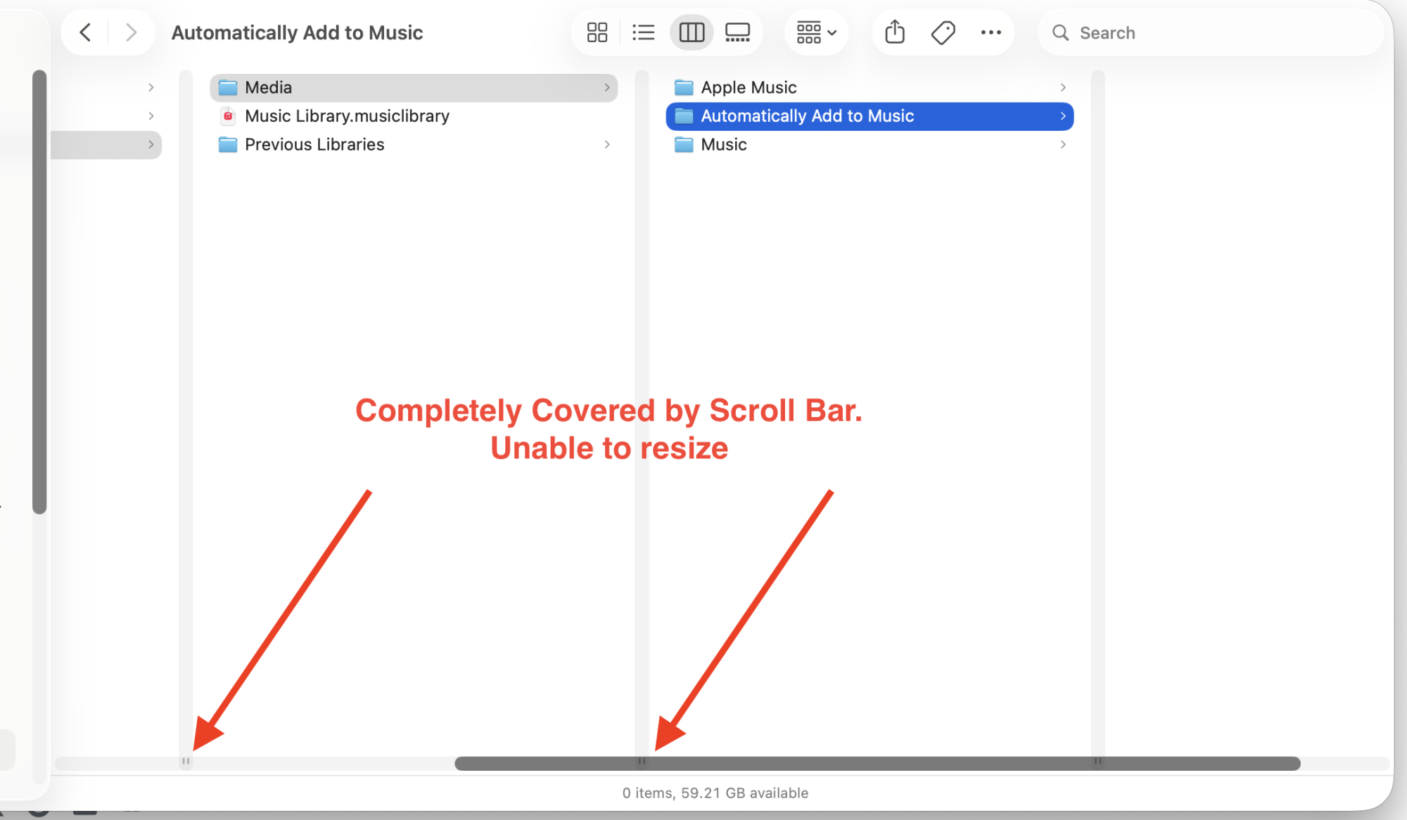 Columns cannot be resized in Finder if scroll bars visible - the handles are covering the only point of control.