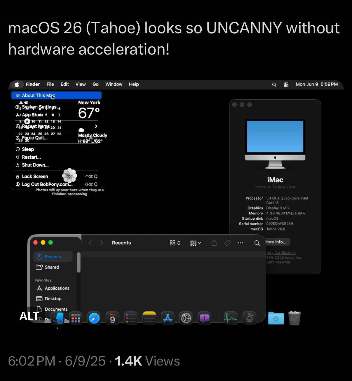 Current state: See post #258: The devs have initial patches for many Macs already, but non-Metal macs will not be able to run Liquid Glass, so old "blurs" will be used instead.