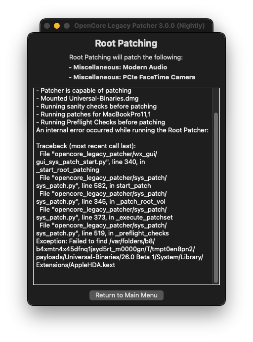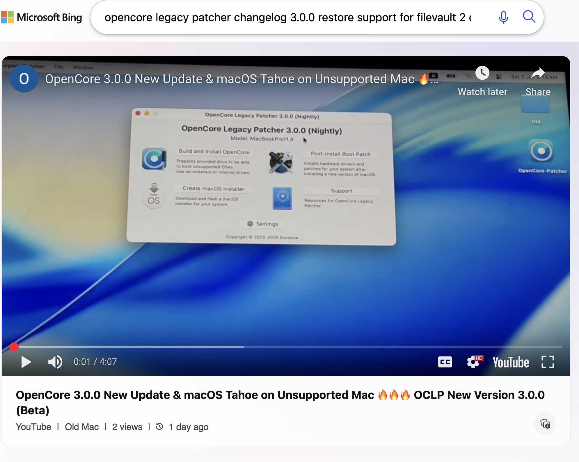 An OCLP 3.0.0 nightly application was then installed onto that Sequoia volume, and OCLP 3.0.0 patches applied.