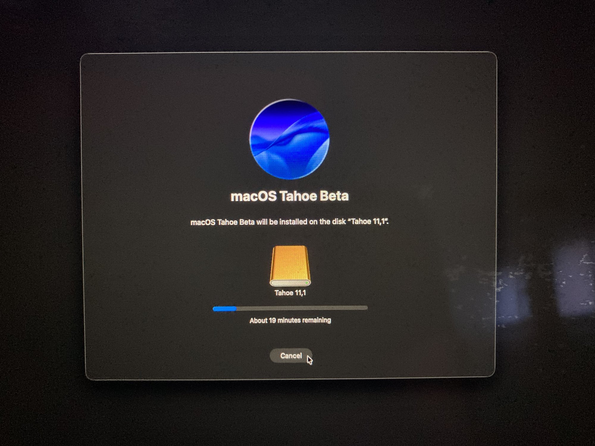 Launched the Tahoe 16 beta2 installer and let it go through the usual installation steps; it was a very slow process, involving multiple reboots and periods when the system appeared to stall, just to restart. Finally reached a login window, and was able to enter password (via external keyboard). However, the login process did finally stall with a “white screen” on the display.