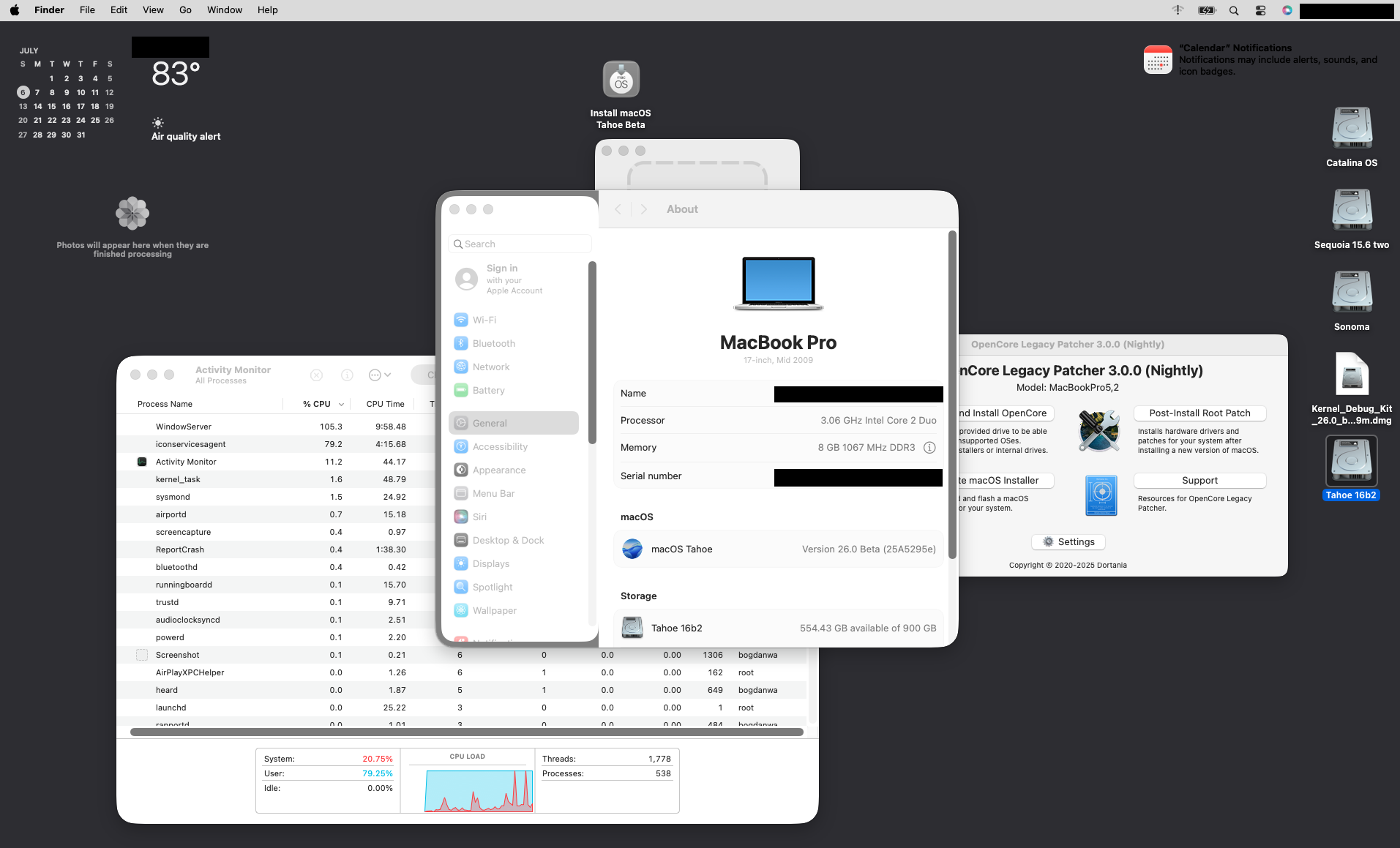 Installed Tahoe 16 beta2 on 2009 MacBook Pro 5,2 fitted with an SSD; interesting results.