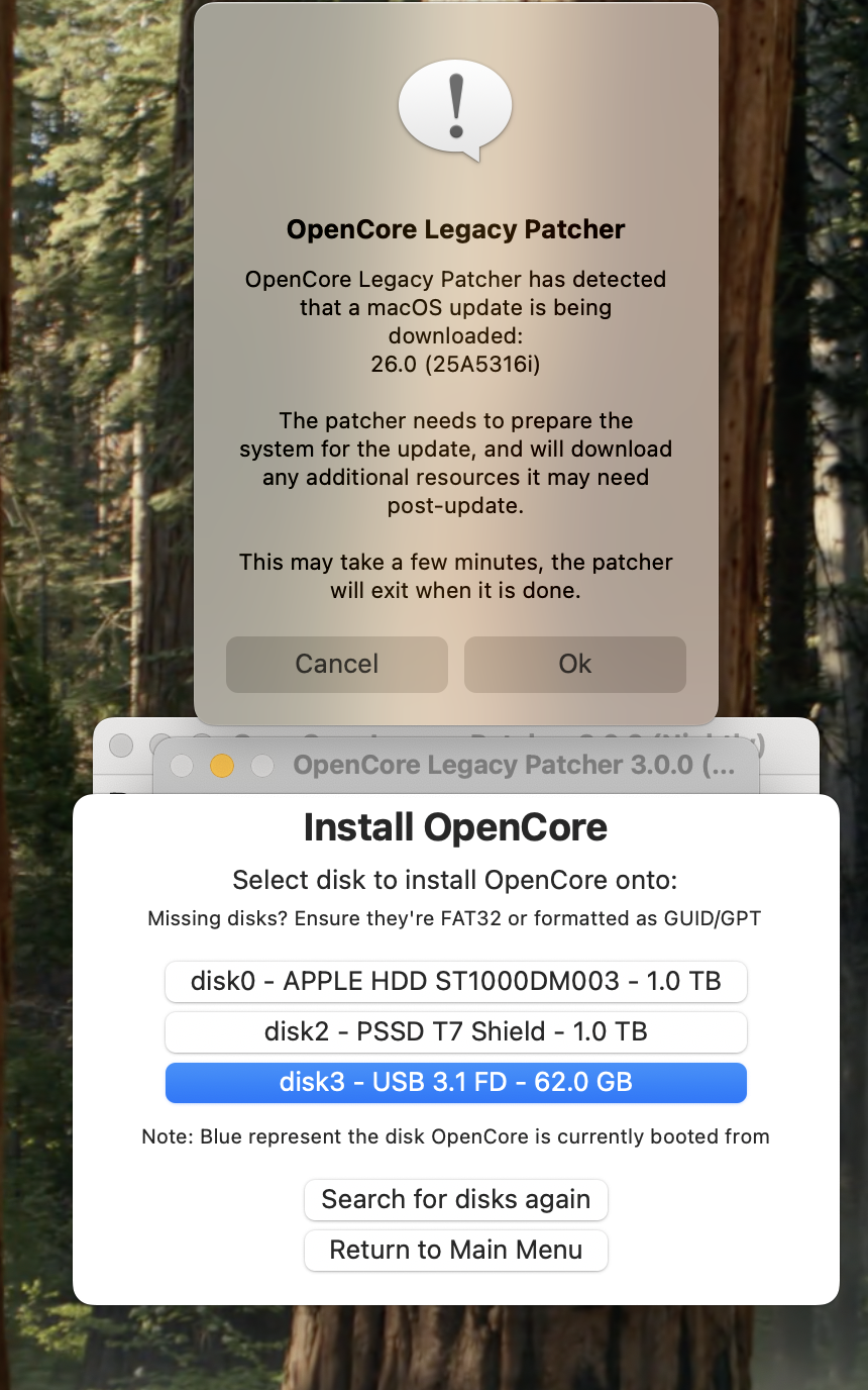 I believe there has been a significant change to 3.0.0n 3 days ago when I did my last experiment with T26B4 the pkg downloaded was as usual, and failed at login, no mouse etc. A few hours ago after deleting that test volume and setting up another, the latest package at installation not only showed the disks available on the installation guide but a time frame after the disk was chosen. When finished setting up on test volume "T26", I started an installation USB with 3.0.0n downloading, I later found the second attatched file. I am now going to install OTA.
