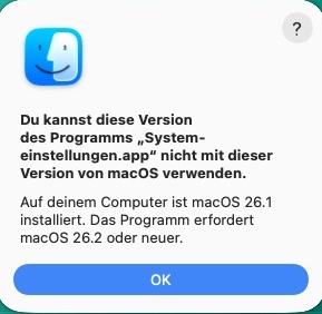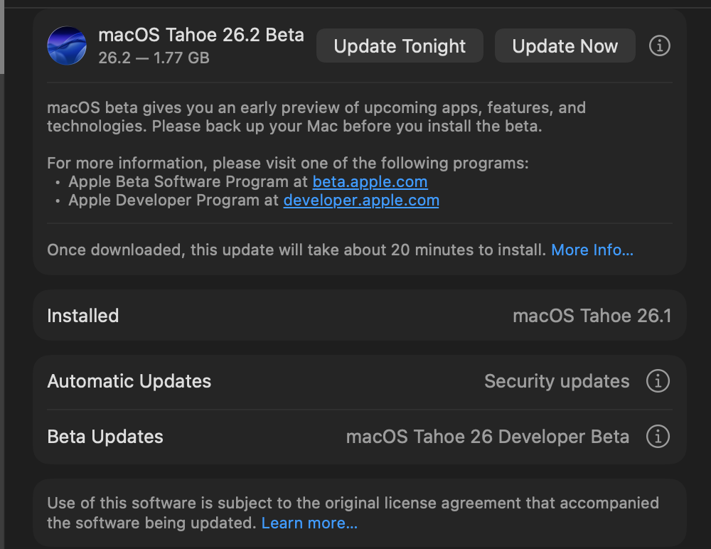 Also, the upgrade of my old legacy rig from Tahoe 26.1 to 26.2 Beta was easy. Still patiently waiting for OCLP post-install patches.