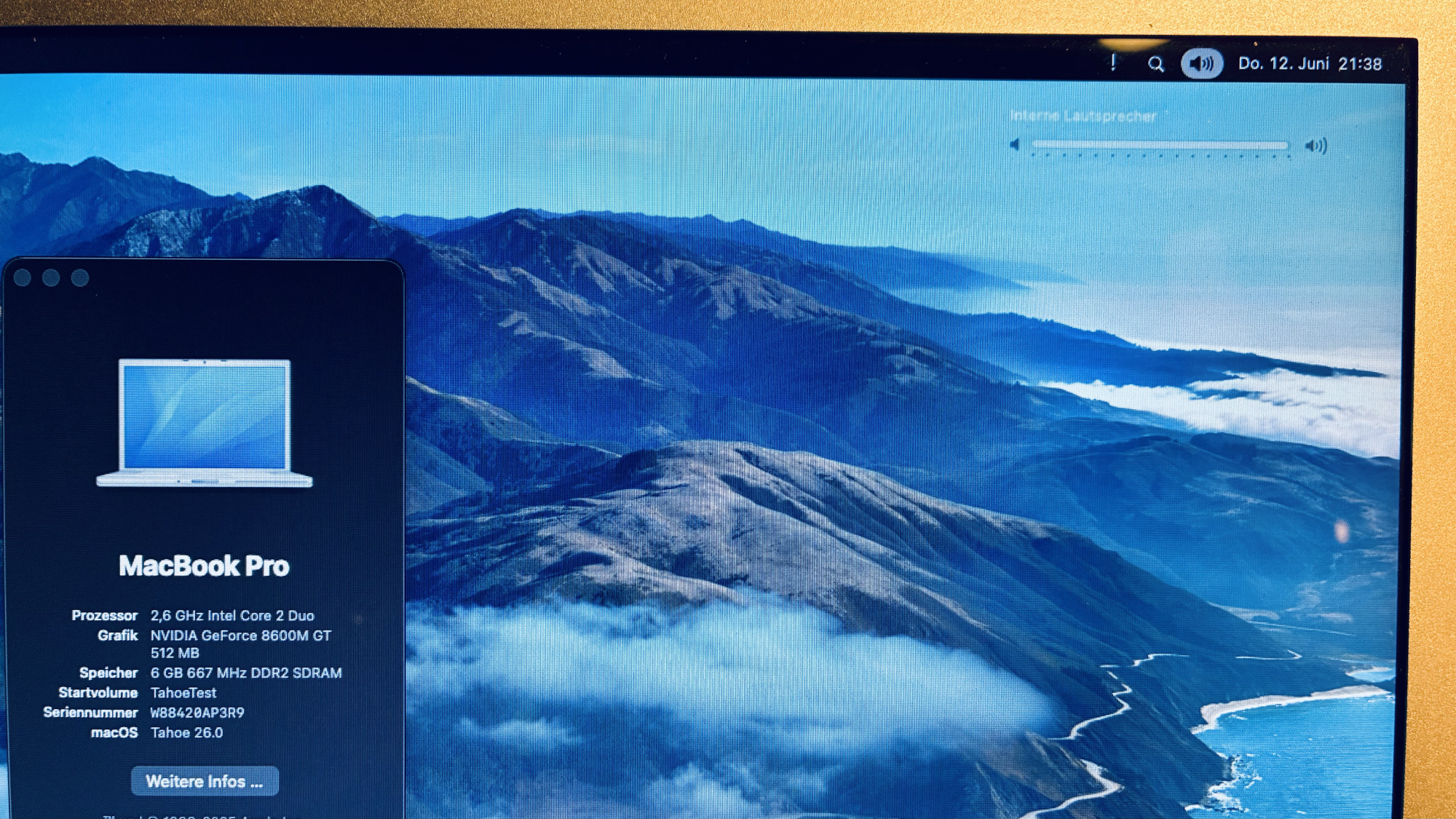 MacBook Pro 4,1 (2008) with 8800GT GPU and 6GB RAM.