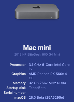 Does your processor support AVX2?Polaris appears to be fully supported now in Tahoe Beta 2. As others have noted, I don't have audio after the Tahoe Beta 2 upgrade. Note that my HackMini8,1 has a Radeon RX 560x (like the real iMac19,x). In order to perform the Beta 1 -> Beta 2 upgrade, I needed to complete the upgrade with the dGPU disabled (UHD630 iGPU only). After the upgrade completed, I enabled the dGPU for normal graphics operation.