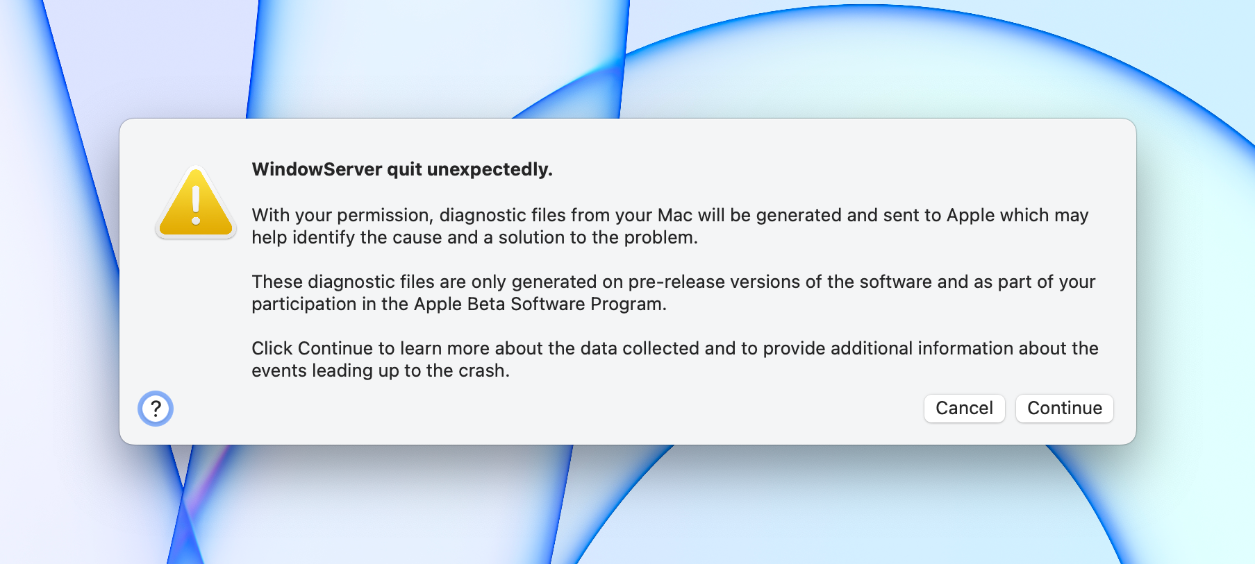 Ugh! Whenever my M1 MBP goes to sleep, I get a "WindowServer quit unexpectedly" crash and it reboots. This has been as consistent as Old Faithful over the last 4 betas or so.