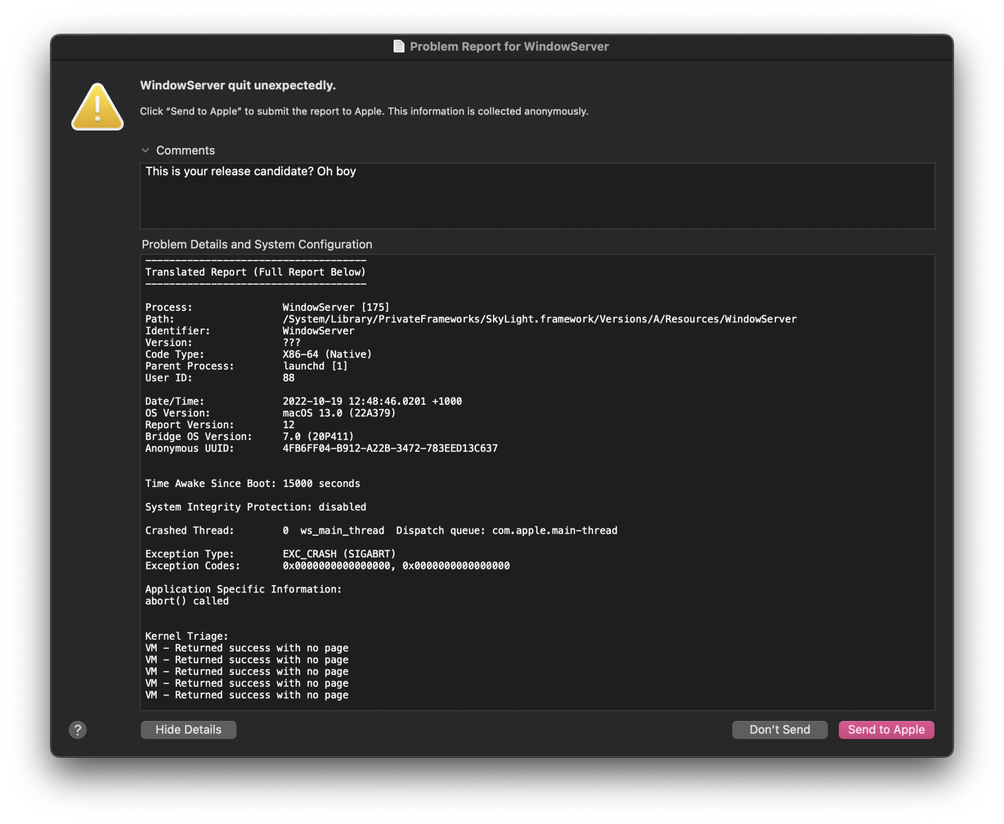 I woke up this morning and my MBP didn't reboot from a WindowsServer crash! Huzzah!Thanks!! It's only been an hour, but so far so good! I've been beta testing macOS (and OS X) for a long long time, I think at least 12-14 years, and for some reason ONLY the last few days of the prior beta was rebooting me at least 5-7 times a morning. Enough to just throw my hands up and shut it off for the day. I'd feel more comfortable having the full installer, though. I'm thinking I'll do a clean install and "start over" with Ventura.