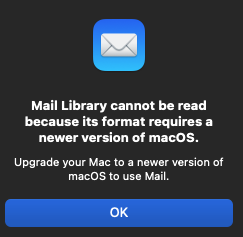 Rolled back to Monterey by erasing boot disk and reinstalling Monterey, then restored from Time Machine backup. One weird problem after restore is that Mail will not launch. Throws up an alert that the Mail Library can't be read, needs a newer version of Mac OS. This one really has me perplexed, as the backup was from before I installed Ventura.