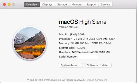 Hack Pro: Xeon X5670 (6 Westmere cores @ 2.9Ghz), 24GB ECC DDR3-1333, RX 580 8GB, WD 1TB 5400 RPM HD, Mojave 10.14.4