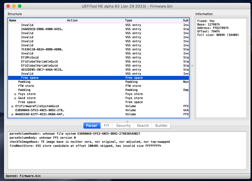 This dump below had two different failures, a corrupt circular log and failed garbage collection on primary VSS store where after the corrupt point the circular log was identified as padding, and the secondary VSS store completely trashed and not even being identified by UEFITool anymore. The owner of this early-2009 got it repaired in the nick of time before bricking it.
