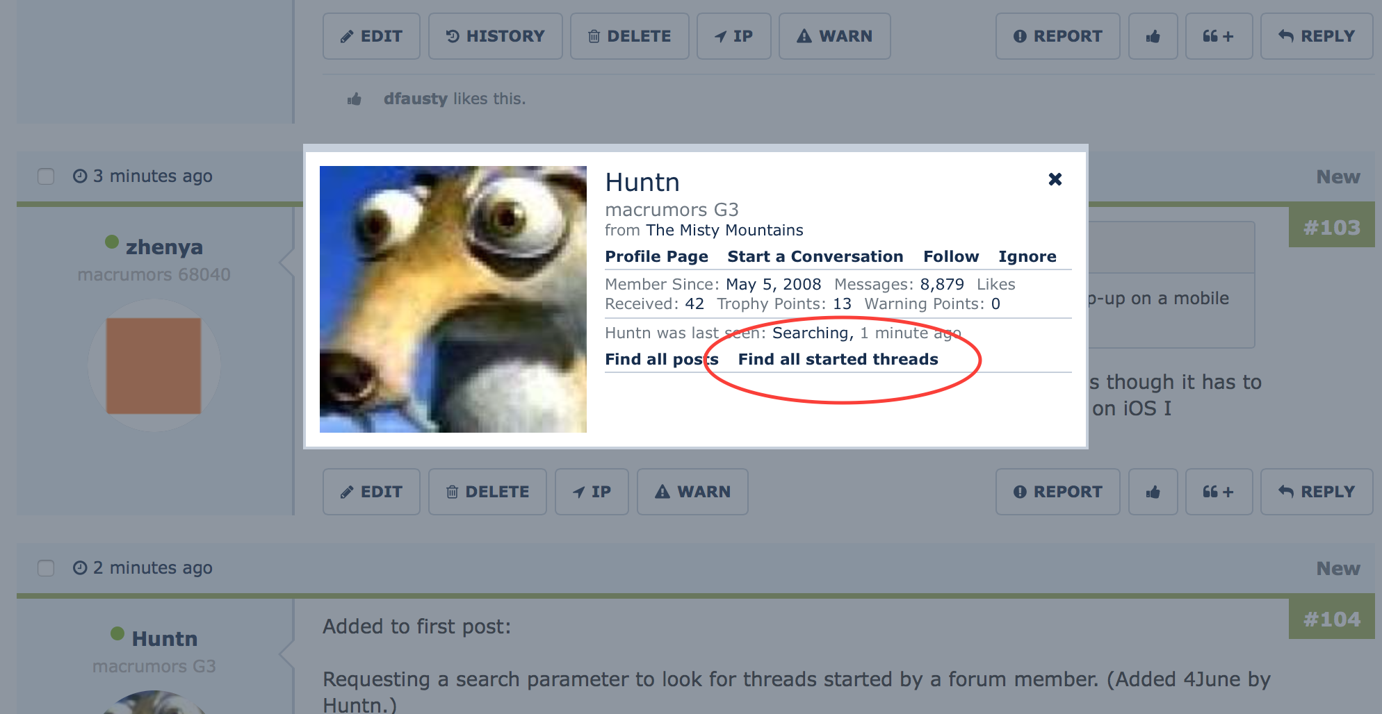 Requesting a search parameter to look for threads started by a forum member. (Added 4June by Huntn.)