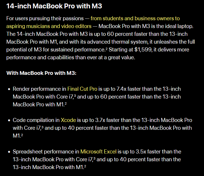 Pretty decent logic. However, Apple is not making any distinction between the M3 variants in this ad. And the "up to" numbers are based on the M3 Pro Max.Why does Apple provide use cases for M3 MacBook Pro that are anything but content consumption?