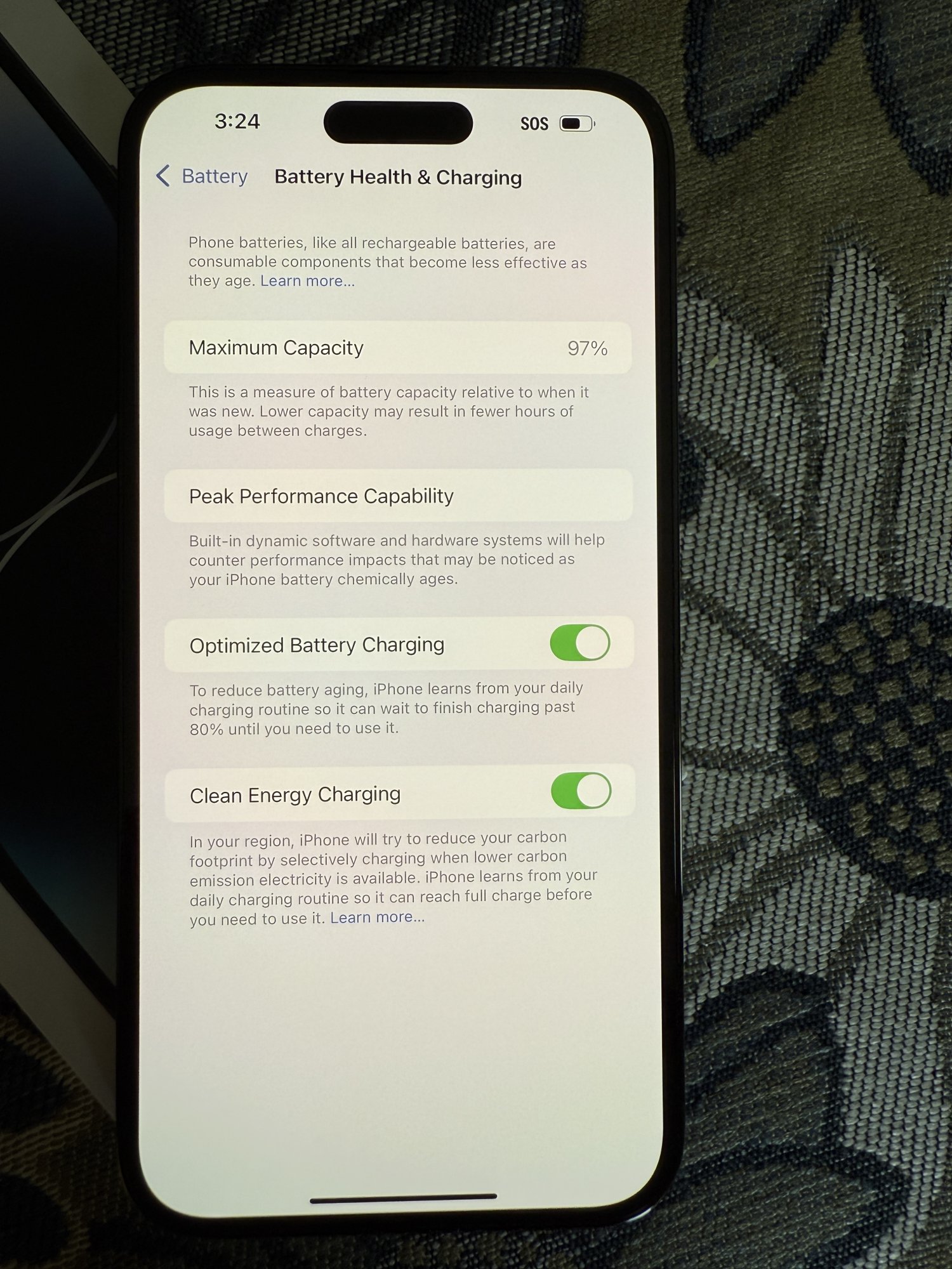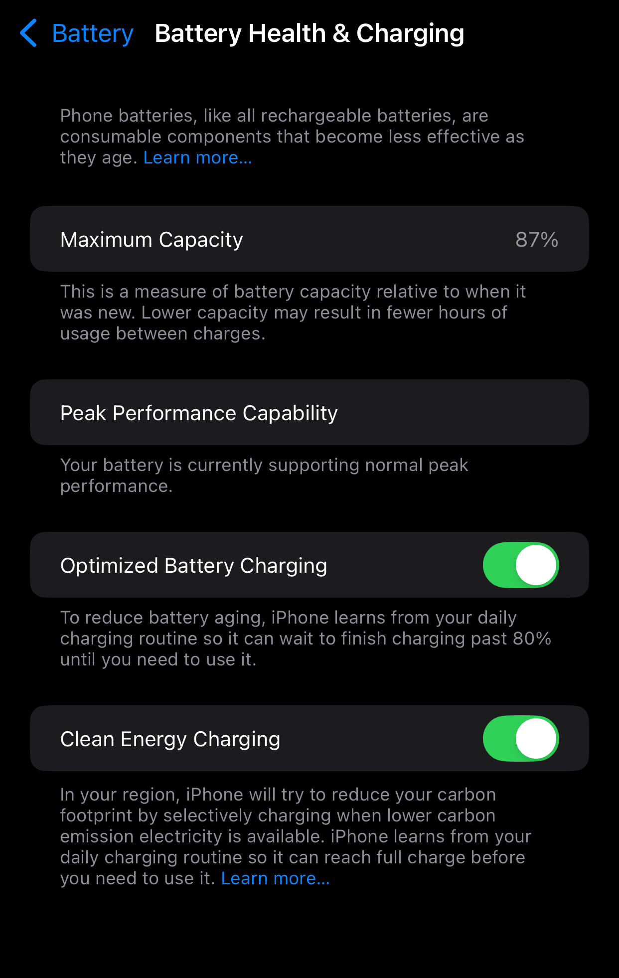 PS. I have optimized charging and clean energy charging switches off. Only reason it was on was because the device was factory reset.