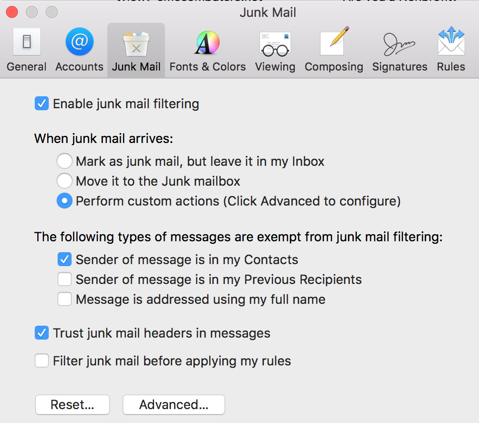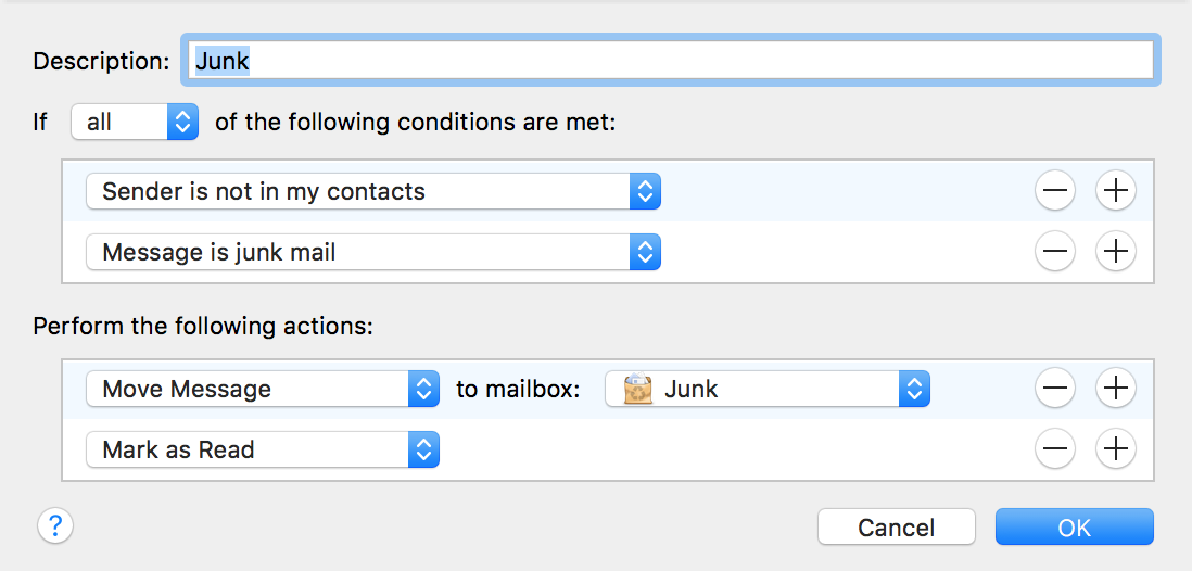 Such a rule applies to mail arriving in your Inbox and being detected by Apple Mail as junk. It does not apply to junk which has already been detected by your mail provider, placed in its Junk folder, and delivered via IMAP to the Junk folder in Apple Mail.It lets you attach a custom rule to junk filtering via the junk tab but it doesn’t actually do anything.