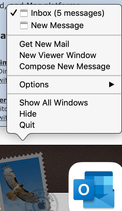 When I try to open Mail, it appears in th menu bar as open but no window ever opens. Pressing and holding option, and clicking on "Mail" in the menubar gives the entry Quit and Close all Windows at the bottom of the menu.