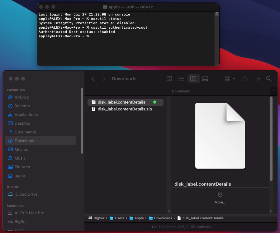Code:Last login: Sun Jul 26 17:32:56 on ttys001 apple@ALEXs-Mac-Pro ~ % diskutil list /dev/disk0 (internal, physical): #: TYPE NAME SIZE IDENTIFIER 0: GUID_partition_scheme *512.1 GB disk0 1: EFI EFI 209.7 MB disk0s1 2: Apple_APFS Container disk1 256.0 GB disk0s2 3: Apple_APFS Container disk2 241.0 GB disk0s3 4: Apple_HFS Install macOS Big Su... 14.7 GB disk0s4 (free space) 268.4 MB - /dev/disk1 (synthesized): #: TYPE NAME SIZE IDENTIFIER 0: APFS Container Scheme - +256.0 GB disk1 Physical Store disk0s2 1: APFS Volume Macintosh HD 236.7 GB disk1s1 2: APFS Volume Preboot 25.4 MB disk1s2 3: APFS Volume Recovery 507.5 MB disk1s3 4: APFS Volume VM 20.5 KB disk1s4 /dev/disk2 (synthesized): #: TYPE NAME SIZE IDENTIFIER 0: APFS Container Scheme - +241.0 GB disk2 Physical Store disk0s3 1: APFS Volume BigSur - Data 4.8 GB disk2s1 2: APFS Volume Preboot 273.3 MB disk2s2 3: APFS Volume Recovery 887.8 MB disk2s3 4: APFS Volume VM 1.1 MB disk2s4 5: APFS Volume BigSur 15.5 GB disk2s5 6: APFS Snapshot com.apple.os.update-... 15.5 GB disk2s5s1 /dev/disk3 (external, physical): #: TYPE NAME SIZE IDENTIFIER 0: GUID_partition_scheme *15.6 GB disk3 1: EFI EFI 209.7 MB disk3s1 2: Apple_HFS USB 15.2 GB disk3s2 /dev/disk4 (internal, physical): #: TYPE NAME SIZE IDENTIFIER 0: GUID_partition_scheme *1.5 TB disk4 1: EFI EFI 209.7 MB disk4s1 2: Apple_HFS HDD 1.5 TB disk4s2 apple@ALEXs-Mac-Pro ~ % sudo diskutil mount disk2s2 Password: Volume Preboot on disk2s2 mounted apple@ALEXs-Mac-Pro ~ % ls -l /System/Volumes/Preboot total 0 drwxr-xr-x 11 root wheel 352 Jul 26 02:50 B78FCD7C-A366-4093-9C33-C78FF3AE61AF apple@ALEXs-Mac-Pro ~ % sudo mv ~/Users/apple/Downloads/.disk_label.contentDetails /System/Volumes/Preboot/B78FCD7C-A366-4093-9C33-C78FF3AE61AF/System/Library/CoreServices/.disk_label.contentDetails
