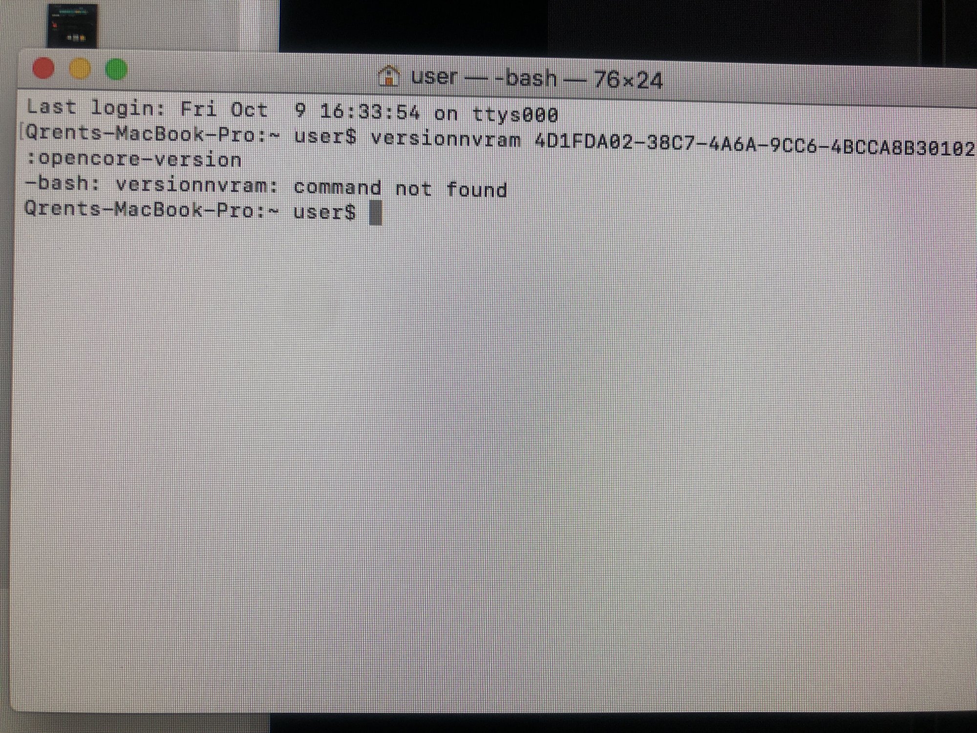 remove versionnvram and leave only nvram 4D1FDA02-38C7-4A6A-9CC6-4BCCA8B30102Thanks for helping me so far. Just one more thing. I have managed to bless and it didn’t give me any errors. I just see any errors SMC. I have the following error when trying to see the open core version.