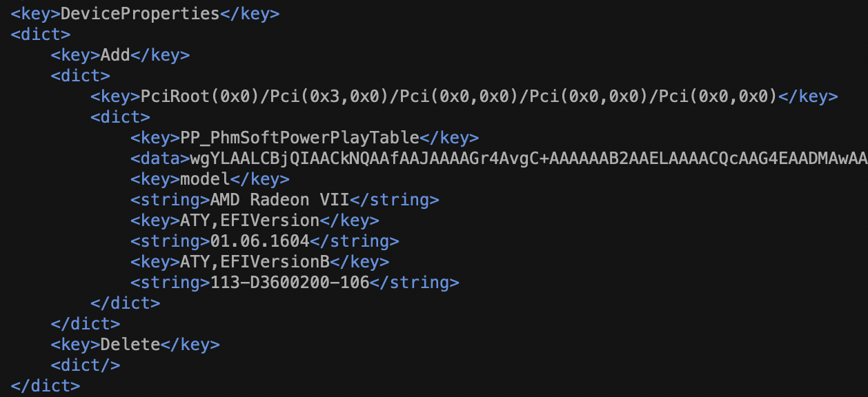 Code:</dict> <key>DeviceProperties</key> <dict> <key>Add</key> <dict> <key>PciRoot(0x0)/Pci(0x3,0x0)/Pci(0x0,0x0)/Pci(0x0,0x0)/Pci(0x0,0x0)</key> <dict> <key>model</key> <string>AMD Vega 64</string> <dict/> <key>Delete</key> <dict/> </dict>