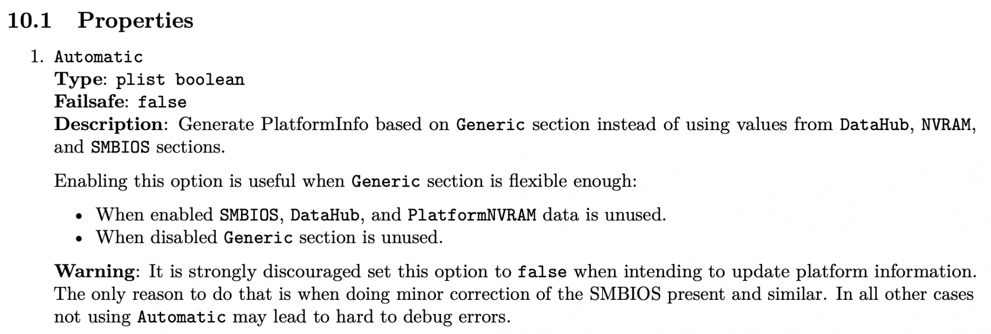 The Warning is clear, set it to False while doing minor corrections of SMBIOS, like we do, therefore I'm leaving the property set to False.