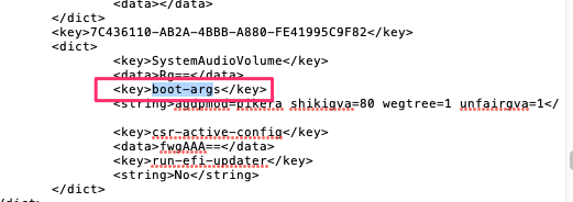 boot-args entries in config.plist. I assume the key should be modified as such: <key>boot-args-v</key>?<string>boot-args</string> here:There is only one boot argument injected. The 2nd one is to tell OpenCore to block the original boot argument.There are twoboot-argsentries in config.plist. I assume the key should be modified as such:<key>boot-args-v</key>?