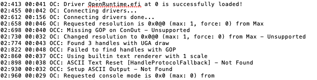 Just having a closer look at my logs, and these entries stand out. Not knowing enough about OC to determine what's happening, could these possibly indicate to you why I'm not getting the 1st stage boot screen on my Mac EFI flashed 7950?