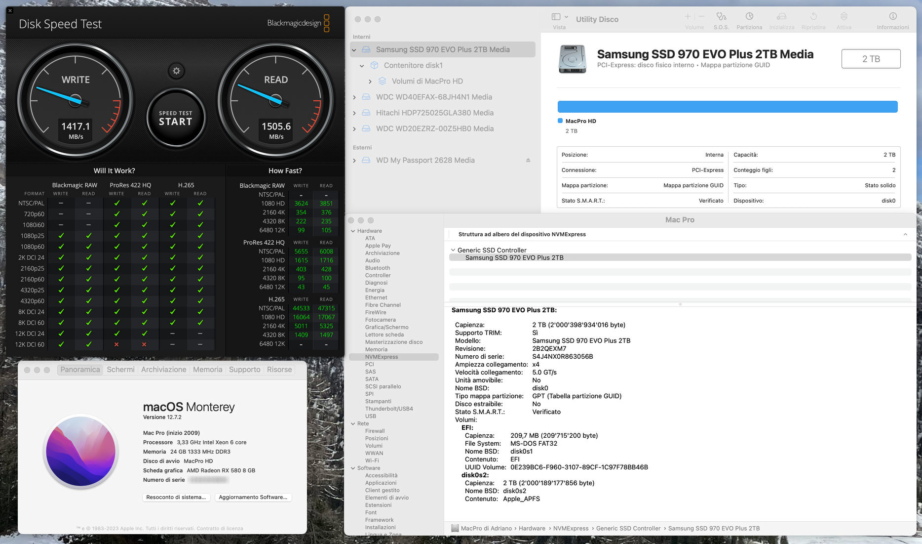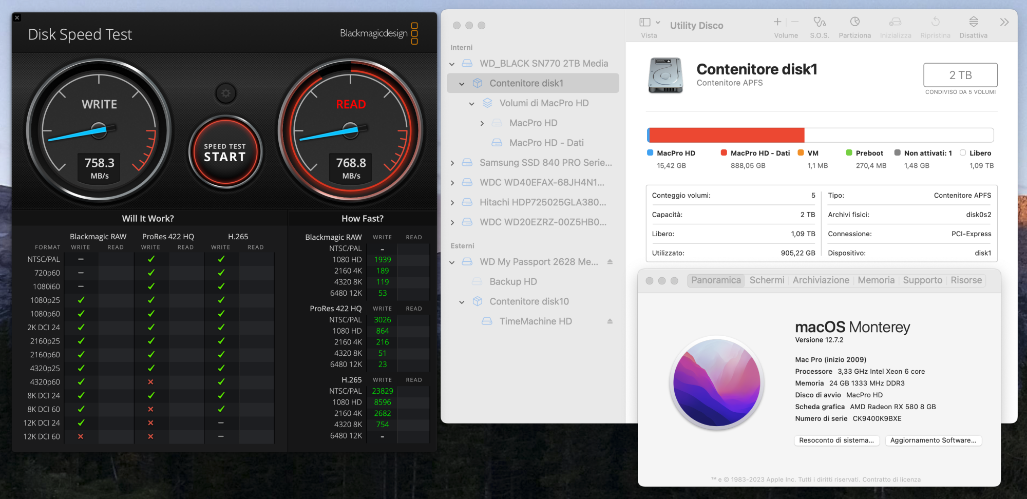 Hi. Does someone use a WD Black SN770 NVMe SSD on his cMP here? I got one to replace my Samsung 970 EVO plus that seems to be disliked in Monterey. With SSN some issues seems to be disappeared, but speed measured by Blackmagic Disk Speed Test are really worse. Even I measure it in Monterey booting from SN770, even I measure it from Mojave (booted from another device). About half of the speeds measured with Samsung 970 EVO plus.