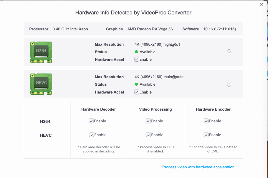 VideoProc shows both H264 and HEVC working. I have DeviceProperties setup per the first post (rebuild-device-tree and unfairgva set).