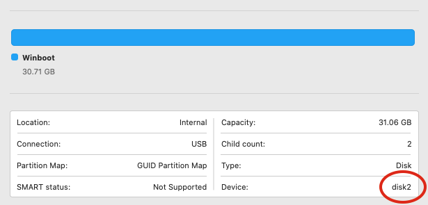- Check the Device number for your Windows drive in Disk Utility again. I'll assume it's still disk2 here, but it may not be.