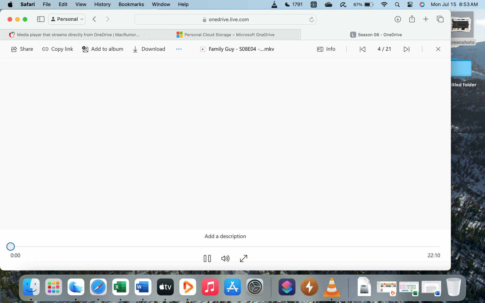 The online video player does not open any of the episodes. It loads for a few seconds and displays an error message. The playback is completely fine before the upload, it is stored on an external hard disk. It is uploaded directly from that drive. If I download the file from the OneDrive website to my laptop, it opens and plays fine in QuickTime (macOS) and in Movies & TV (Windows). I know that the video files uploaded to OneDrive are uncorrupted because Infuse can stream them in 1080p with no problems. The encoded subtitles even stream properly.