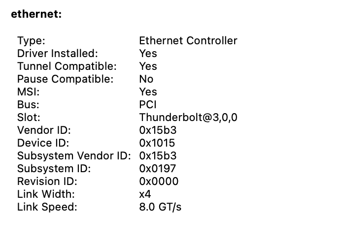 4. verify the kext is loaded through `kextstat | grep "AppleEthernet"`, check mlx is shown.
