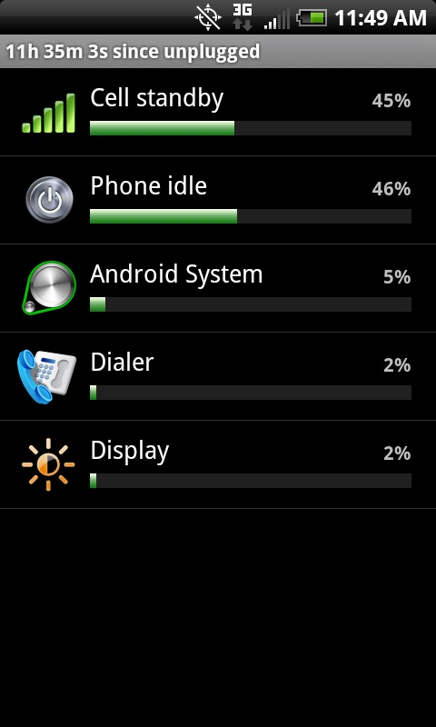 Yep, as I said before, people getting only 4-8 hours battery life are doing something wrong for sure. They dont know how to run their phone correctly and leave unnecessary things on or running. I have no task killer and easily get 10-12 hours with moderate use on the stock battery. Here is what its like with my 1800mah battery in. Not running 4G, BT or GPS but wifi has been off and on when I needed. I also dont have my twitter, facebook, friend stream and all that other stuff updating every hour or two. Changed it to once a day and I can always manually update if I want. 11hrs 35mins off the charger with moderate use and I am still at 63%