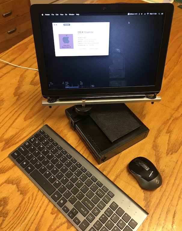 I had considered reusing the trackpad somehow but it didn't work with the design and these older trackpads had limited functionality compared to modern versions anyway plus now it's meant as a desktop unit. It no longer has a optical drive or battery, this allowed me to squeeze it into a pretty tight space. From experience making OSX86 machines I was able to cobble together a decent power management bit by modifying a couple kernel extensions. I broke the BT connector at the MB so use a IOGear 4.1 dongle which works far better than the onboard anyway. It's running Yosemite just fine, it could do Mavericks or Sierra but for a C2D machine of this age 10.10 is less resource demanding