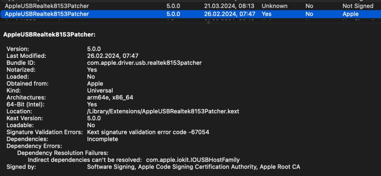 /System/Library/Extensions/AppleUSBRealtek8153Patcher.kext/Contents/MacOS/AppleUSBRealtek8153Patcher: Mach-O universal binary with 2 architectures: [x86_64:Mach-O 64-bit kext bundle x86_64] [arm64e:Mach-O 64-bit kext bundle arm64e]