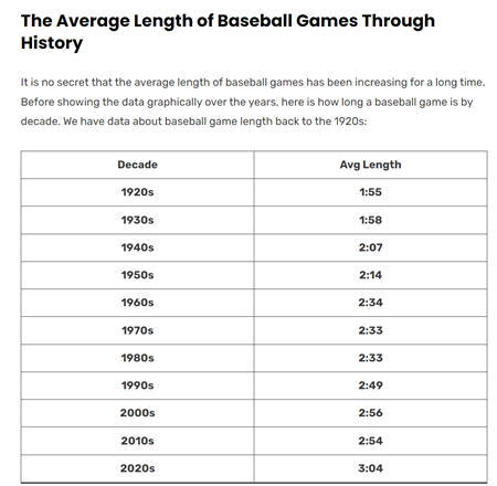 When I was a kid, watching a game on TV - it took 2 1/2 hours (1970s), now (prior to the pitch clock) 3 hours. What made it horrible was a trend to stop the game. Do you remember a few years ago, where a manager would pull the starting pitching in the first or second inning (for no reason) or a reliever facing a single batter? Its conceivable at that time to have three pitchers for 3 batters. How in earth would you be able to keep someone watching the game on tv when there's so many stoppages?