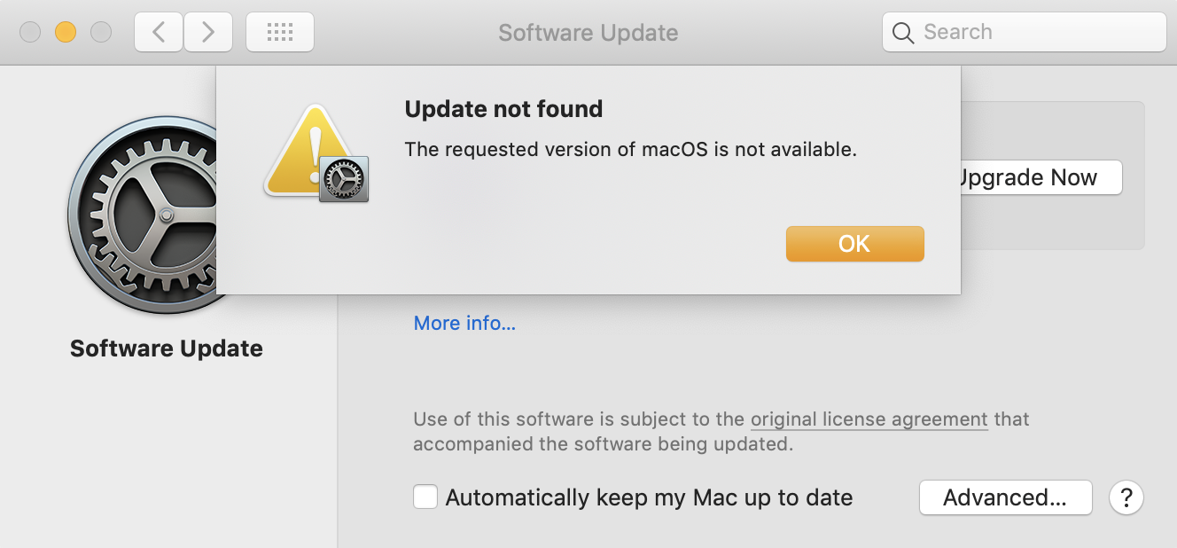 so i do my normally google for the apple link to get os high sierra, it takes me to the MAS, great! i click "Get"... im running mac os 10.4.6 on this macbook, so it takes me to "software update" in system preferences, where it proceedes to give me this error