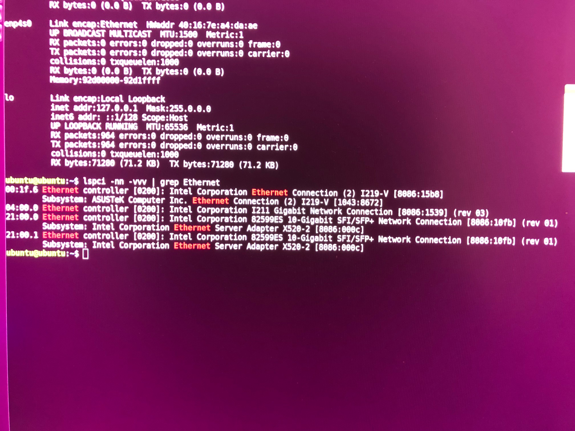 01:00.0 Ethernet controller [0200]: Intel Corporation 82599ES 10-Gigabit SFI/SFP+ Network Connection [8086:10fb] (rev 01)