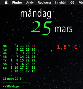 A funny thing happened since I switched from High Sierra. In Terminal commands like date +%A and date +%B give output in Swedish (”Måndag” and ”Mars”, respectively), but Geektool outputs ”Monday” and ”March” in English. Same thing happens to ncal. The calendar just below (25 mars 2019) runs through icalBuddy and shows Swedish dates.
