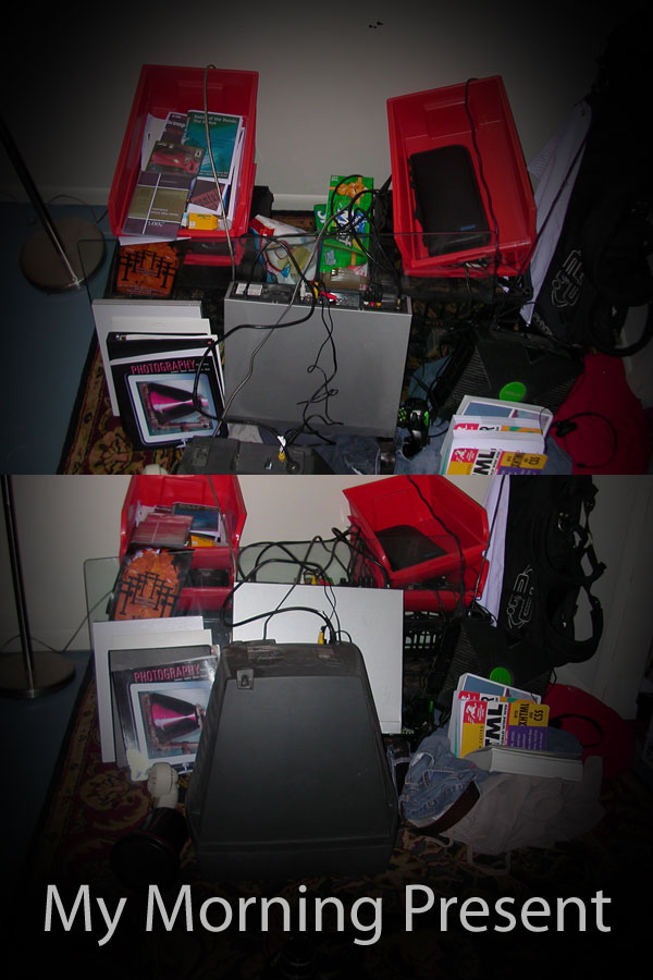 I am in a hurry, but I woke up in my bed about 5 feet from this disaster zone. I never heard anything in the night and must have been in a real deep sleep. I have to pick all this up before I go to school in 40 minutes. I guess the good old plastic storage containers finally gave out. Must have been that HTML book!!!!