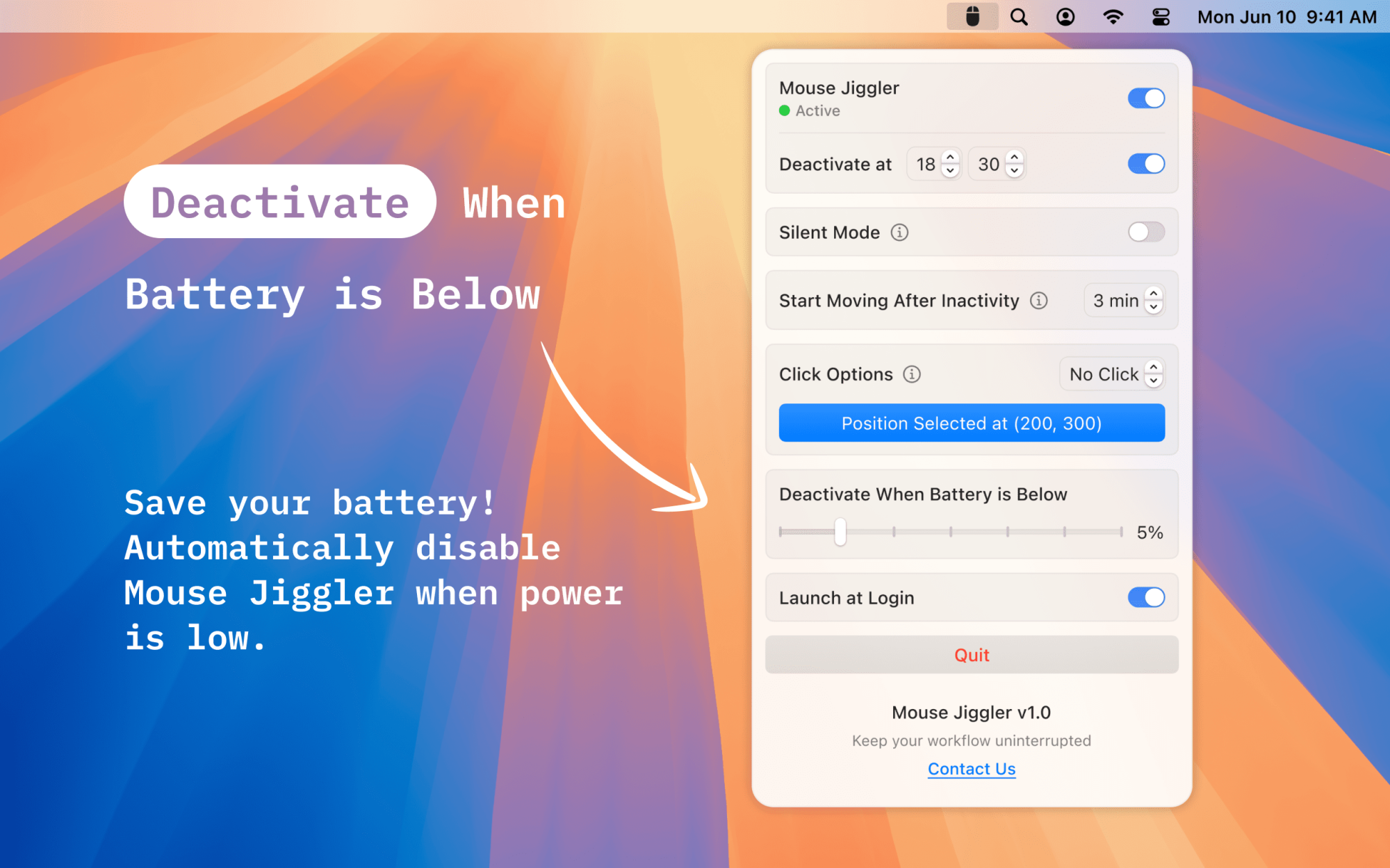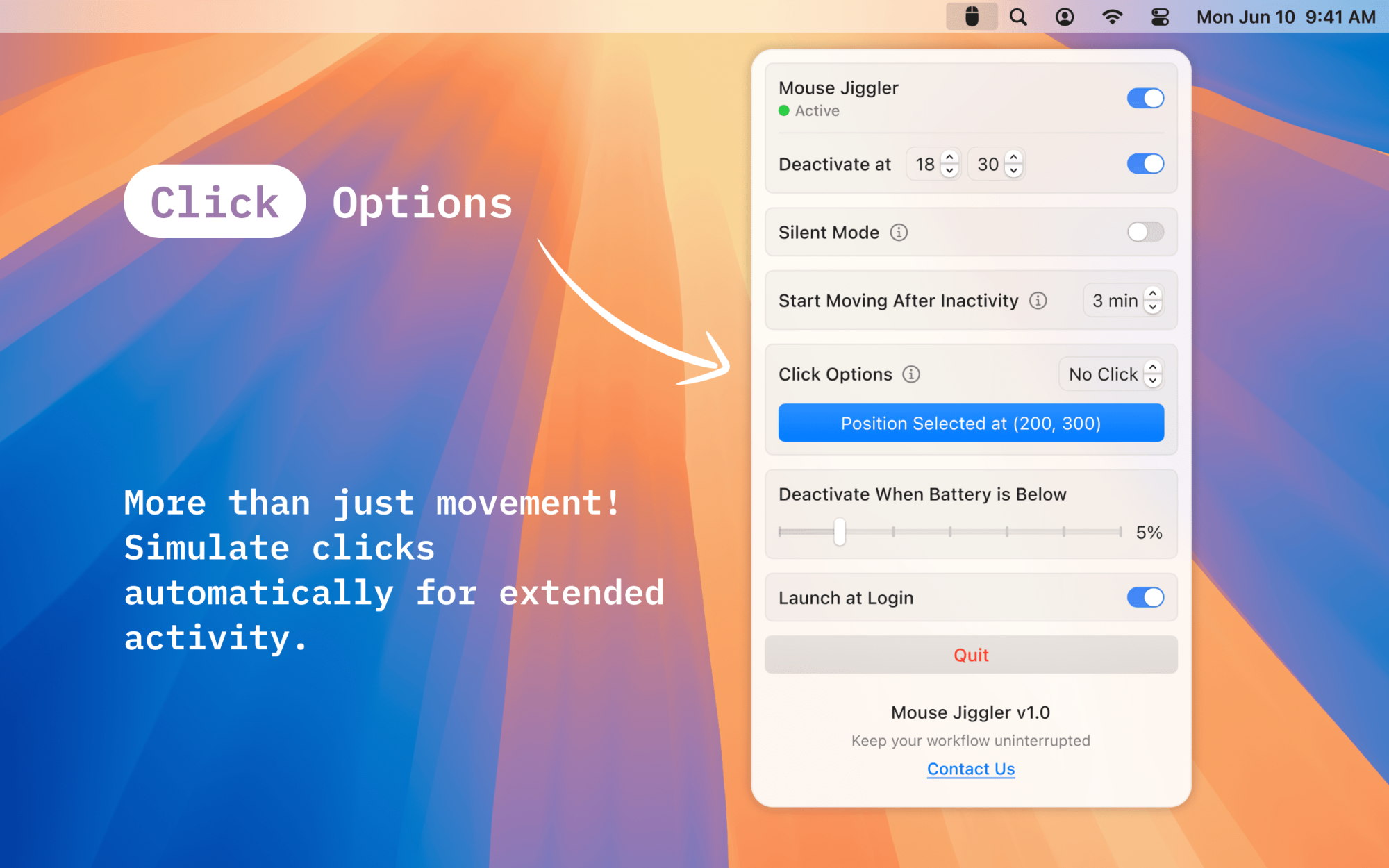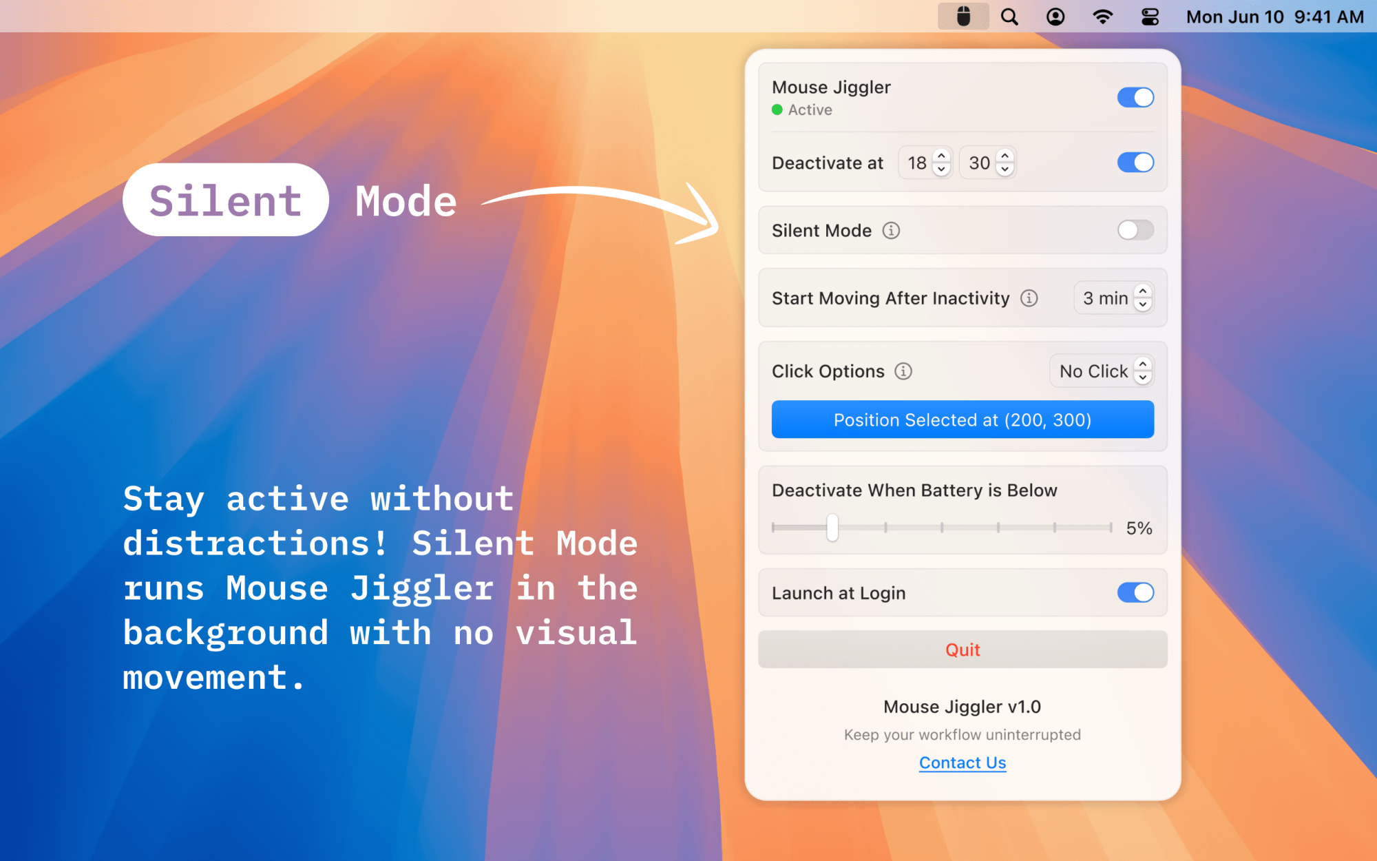 I’m excited to introduce Mouse Jiggler, a simple yet powerful tool designed to keep your Mac awake during important tasks. Whether you’re presenting, coding, monitoring systems, or attending a virtual event, this app ensures your screen stays on - without interruptions!