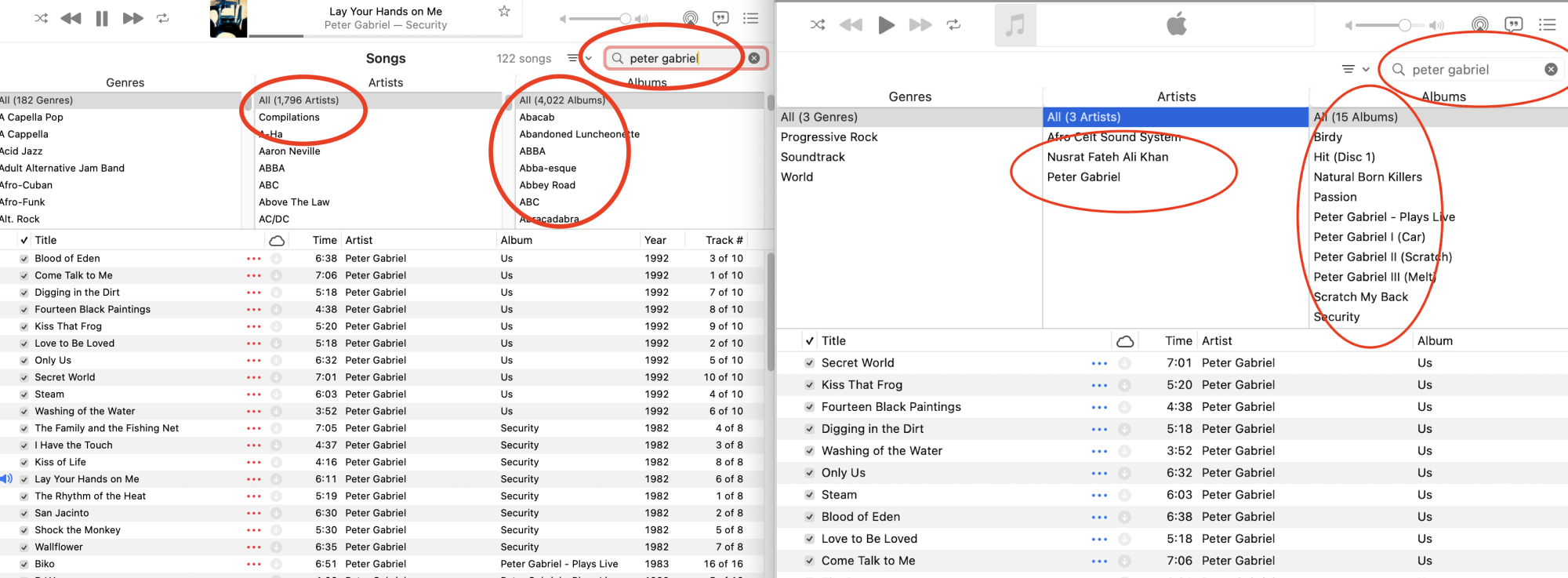 Attached is a screen shot of search results from my iMac's local library (on the left) and my MBP's local library (on the right).