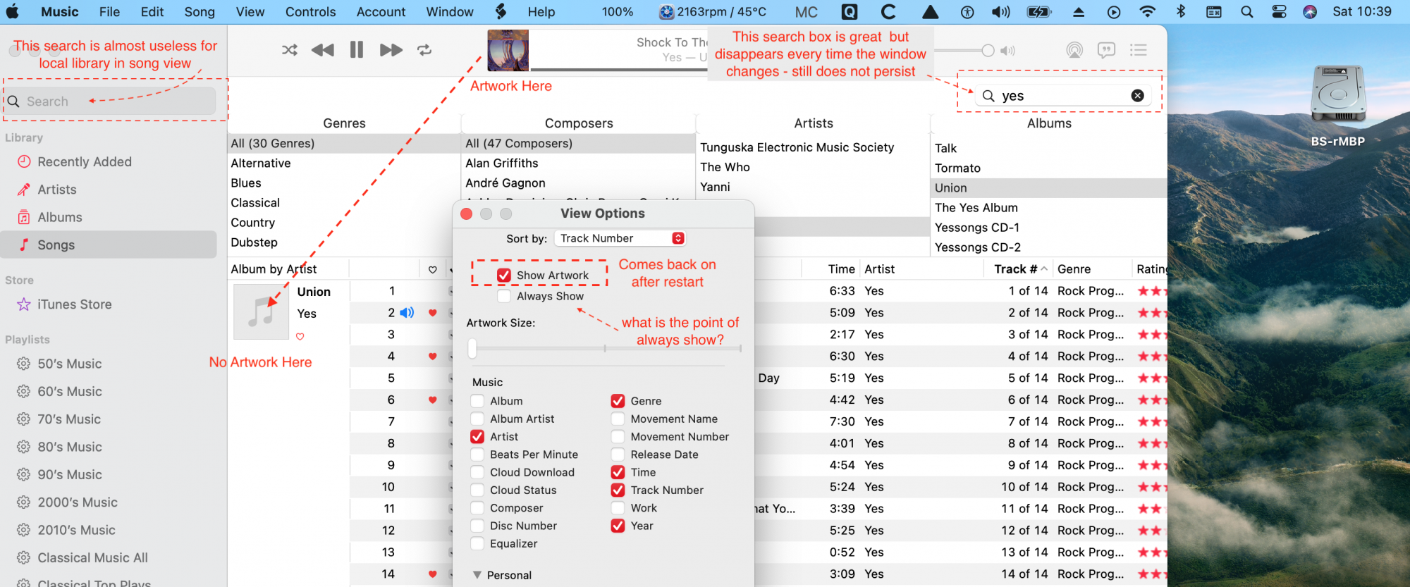 Thanks for the screenshot of the album view! Is there a way to make the tracks a bit smaller? In iTunes I had 2 rows of tracks and I could display up to 75 tracks on one page on my 27 inch iMac. Wonder if it's possible to view more tracks at once on a large screen because viewing only 12 tracks seems like a waste of space (if the album is longer than 12 tracks). Maybe it has to do with resolution and scaling of the OS? Seems like it should be able to show a lot more tracks at once!