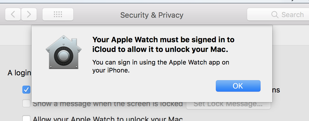 If I go to System Preferences > Security & Privacy the "Allow your Apple Watch to unlock your Mac" option is not checked. If I check it, I get prompted to enter my account password (which I do). I then get the following message dialog: