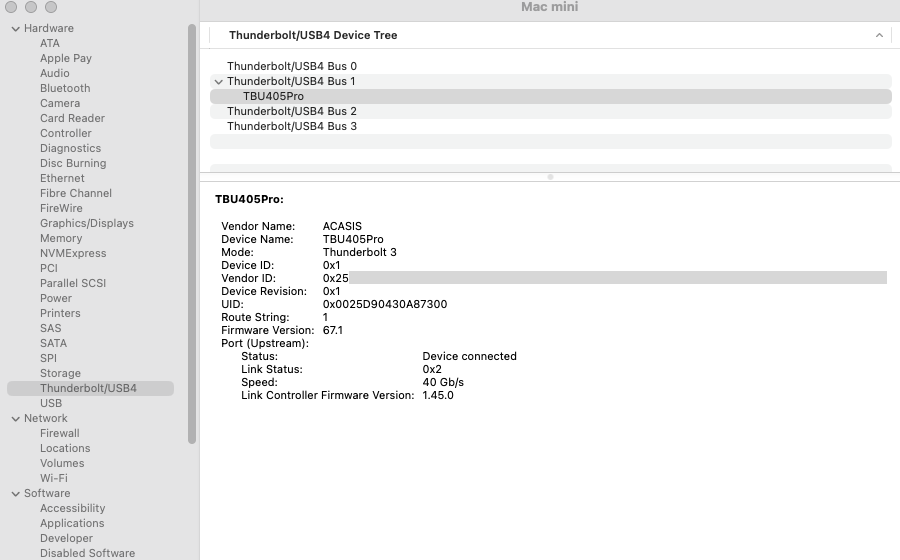 The hub I mentioned in post #40 is working great. I can even plug my monitor into it alongside the two Acasis enclosures. I suppose that means I could plug another hub into one of the other three TB ports on the back and get 40gbps from even more stuff, if I had it.