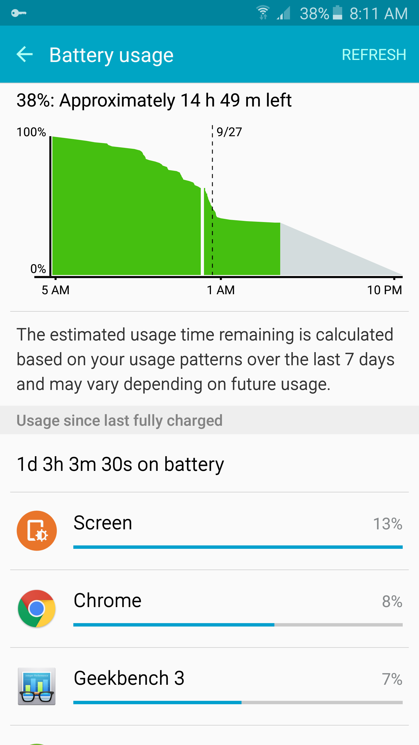 still at 40% left im still on my first charge and you can do a sm-920i search on geekbench and see how many times iv ran my phone.its crazy but it actually runs cool to the touch only gear vr gets hot but that is maxing everything including the gpu and on my stock gs6 after about 35-40 min the phone goes into cool down mode.these are samsung speed bins that they built into the kernel bud.i guess sammy was expecting the 810 or 820 to come out and had this monster ready for it and they never needed to use it to its full potential