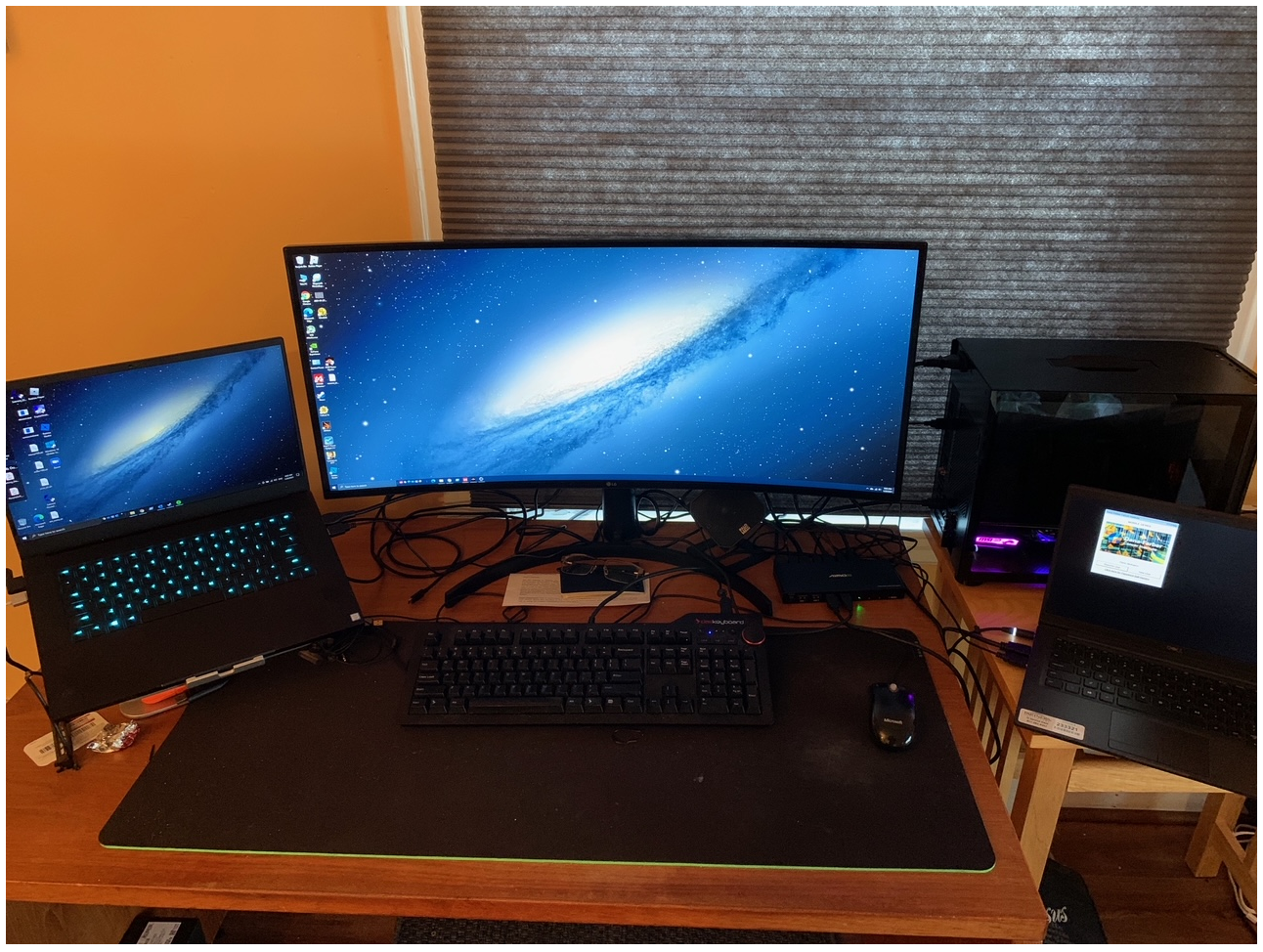 My work area is a bit crowded, but thanks to my KVM switch (that thing is a life saver), I can switch from my desktop, to my work computer (laptop in the left) to my Razer (still being used)