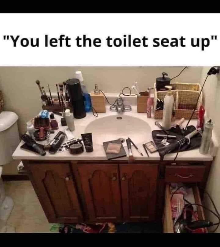 Fair enough lol. Btw, I did mean that in jest, and mainly referring to this meme which I got a kick out of.I disagree. Raised toilet seat is 10x worse! You wake up, have to go NOW, stumble into the bathroom still half asleep, sit down to do your business, and your butt is halfway into the toilet bowl before you realize what's happening. No amount of hair clogging up your drain or makeup stuff getting in your way on the sink could possibly compare to that unpleasantness! 😡
