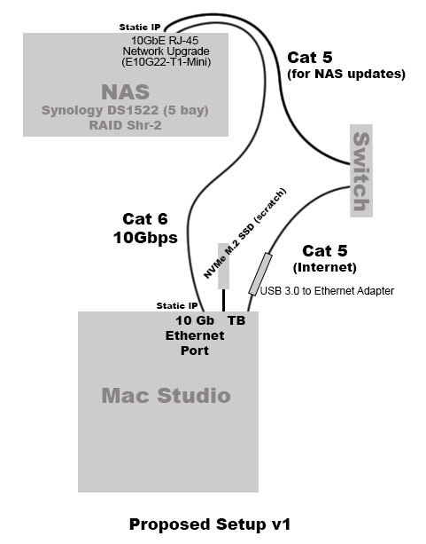 The diagram pretty much nails it; with the exception of the CAT between NAS and switch; you really don't need that since your intention is to secure the NAS away from the internet and rest of your LAN. The major DSM updates can be pushed from a computer accessing the NAS via browser, in this case Safari running on the Mac Studio that can upload the update file you download in macOS. The software packages though may be a bit harder to get updated manually.Thanks for that tip on the NAS 10GbE card. I'm now looking at the Synology DS1522+ that has a 10GbE optional upgrade. The way you are connecting the Studio to the NAS and Studio to the Internet and NAS to the router or switch is exactly what I'd like for my setup. I put together this diagram which includes notes contributed by members in this forum. I also added a NVMe M.2 SSD that I can pull out from my Mac Pro and pop into an enclosure for fast external storage. I can probably add more notes, but want to put this out there for critiques.